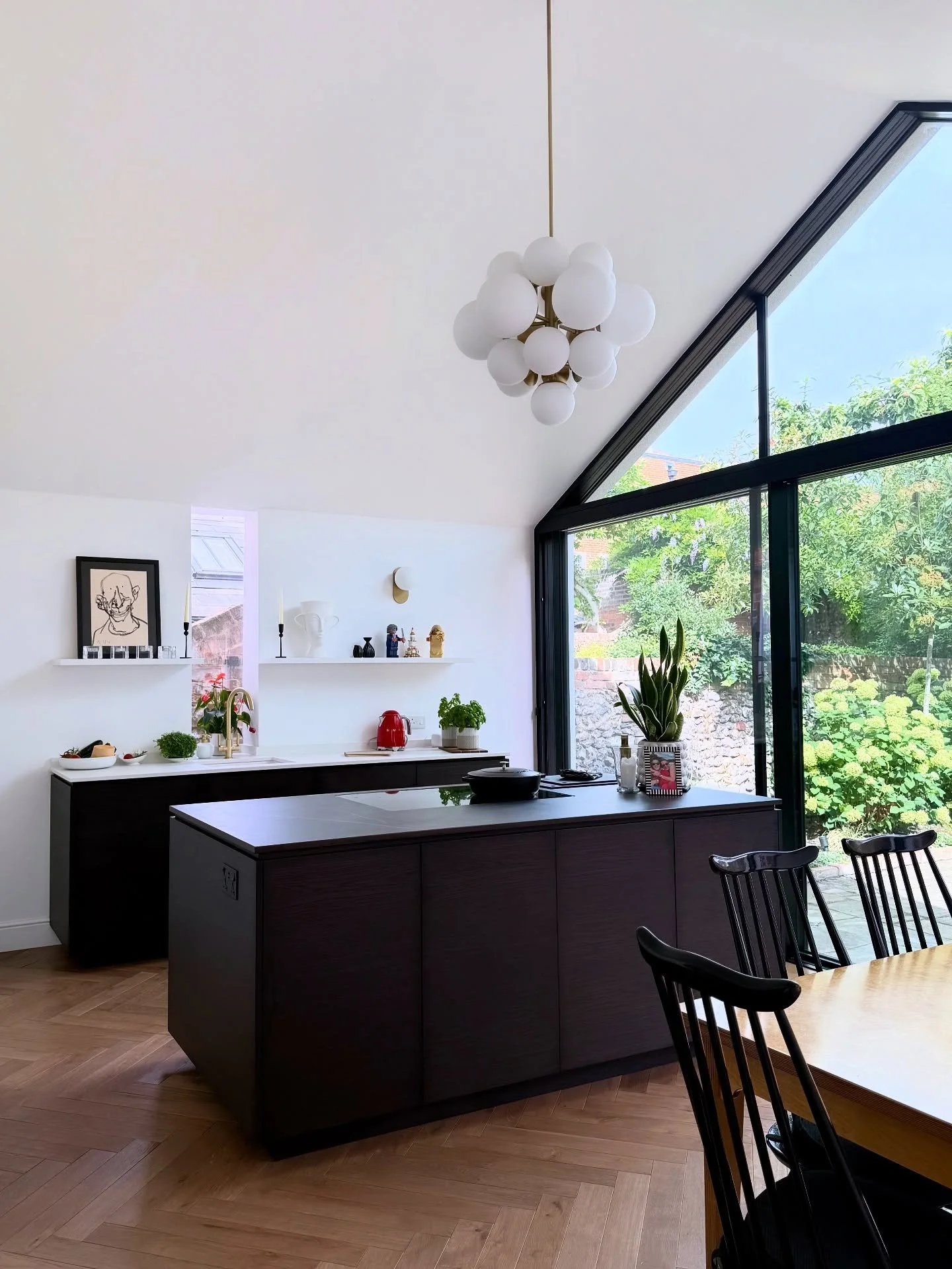 View fullsize A recent kitchen project with a neutral backdrop to guide your focus from the dark stained oak cabinetry to a striking architectural pendant to the A-Frame glazing and finally out into a stunning urban garden in the centre of Henley-on-Thames.